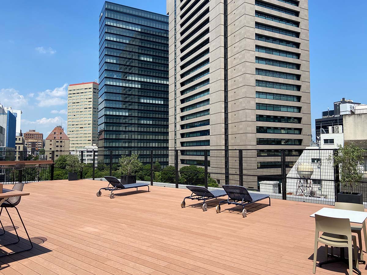 何故サクッとだけのご案内なのか?というと、カタチ的には屋上は全面デッキが敷かれ、テーブル&チェアー、そしてスリーピングチェアが写真のように品良く配置されています。それと、仕事が出来るように、WiFi完備、勿論コンセントも多数配置されています。