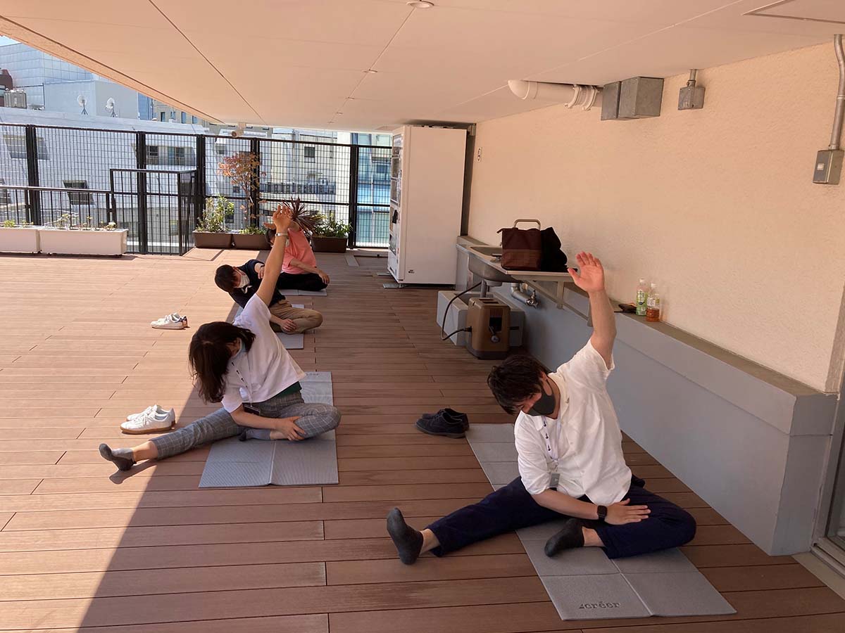 ここでは、入居企業のみんなと作ったエクササイズ部が毎日10分、エクササイズしたり、ランチを食べたり、仕事したり。たまに寝ている方も見つけますが使い方は皆さん次第です。