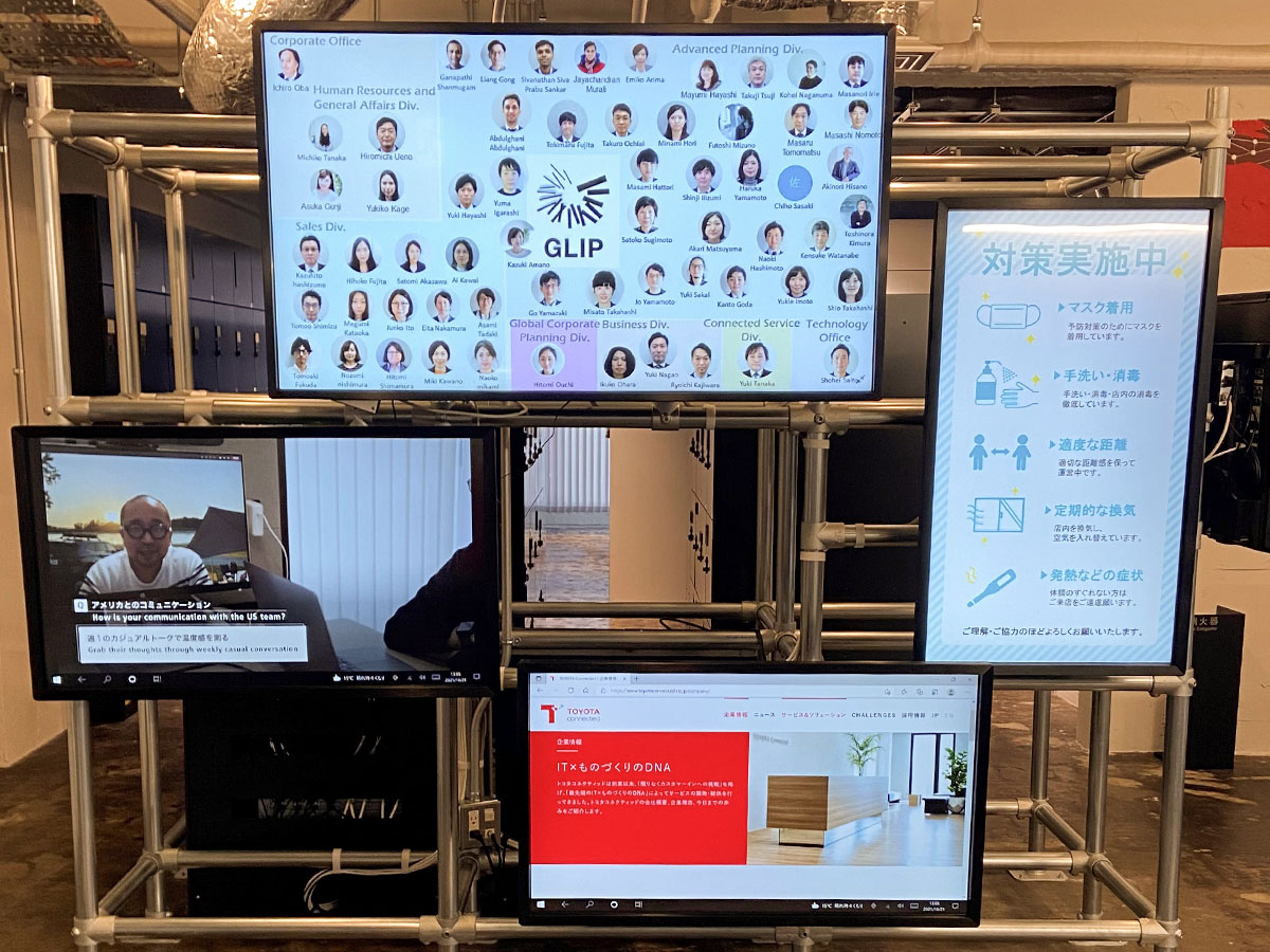 このモニターには、本日の注意事項、従業員出社状況、社内イベント情報、本社の情報、GLIP紹介など、毎日表示内容が変わります。