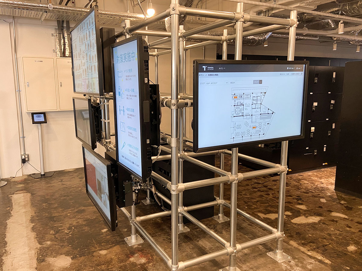 写真をご覧ください。5階のガラスの扉を開けるとまず目に写るのが通称ジャングルジム。細かく言うと、ジャングルジムに5つのモニターが設置されており、それぞれのモニターには従業員が必要な情報が映し出されています。従業員は、このジャングルジムの両脇を通り、奥のロッカールームに行き仕事の用意をします。そうです、従業員はジャングルジムを通る際には必ずモニターを見ることとなるのです。