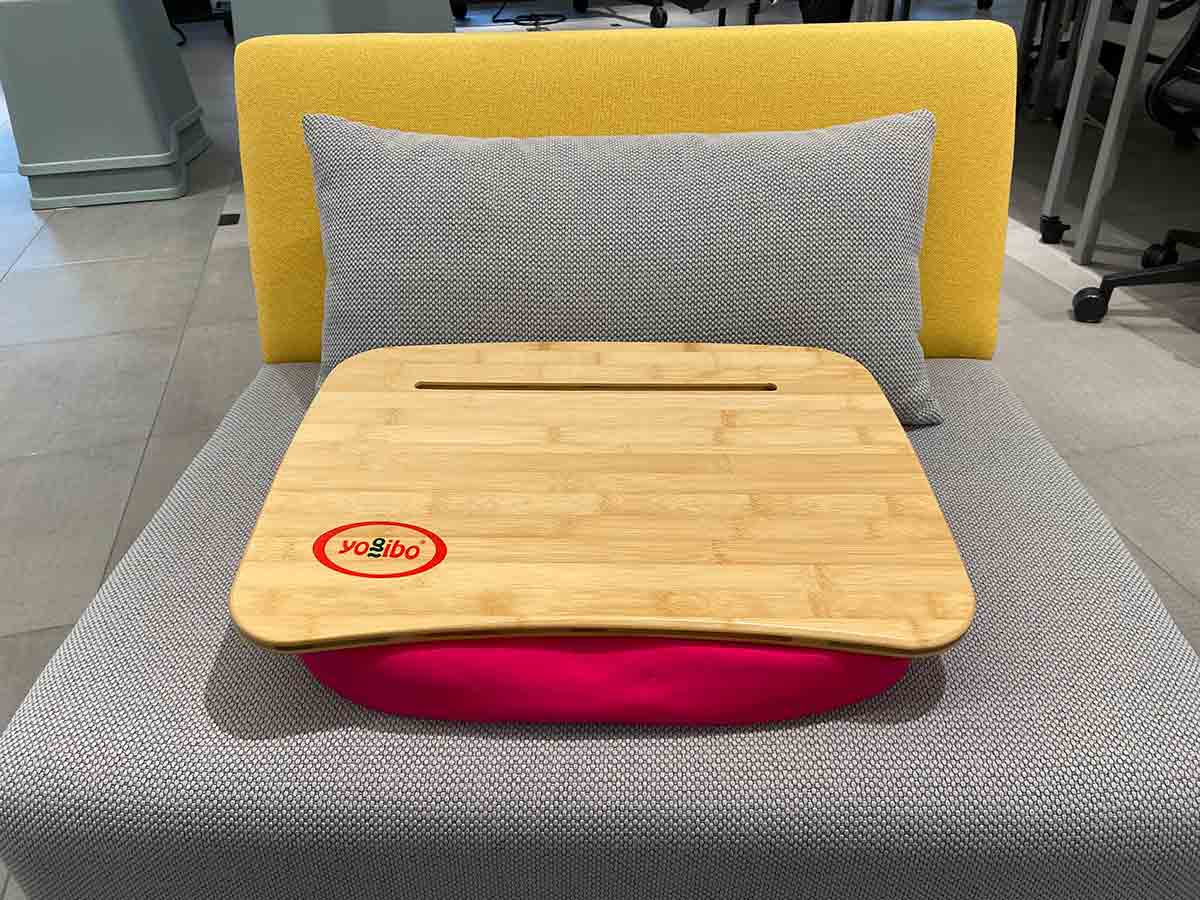 ソファに座って仕事をする時に、ひざの上にノートパソコンを載せて使用しますよね?このYogiboは小さなテーブルと一体になっています。ソファに座りひざの上でパソコンを安定させるためにYogiboをひざの上に載せて、備え付けのテーブルにパソコンを載せて使っているのです。というかそのように使うためのYogiboの商品だそうです。これが、かなり安定してパソコンが操作出来るので優れものなんですよっ!ソファで仕事をするときは病みつきに!このYogiboの取り合いで殴り合いにならないように私が毎日見張っています。(笑)