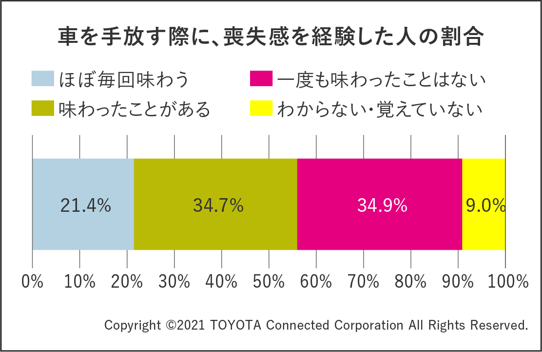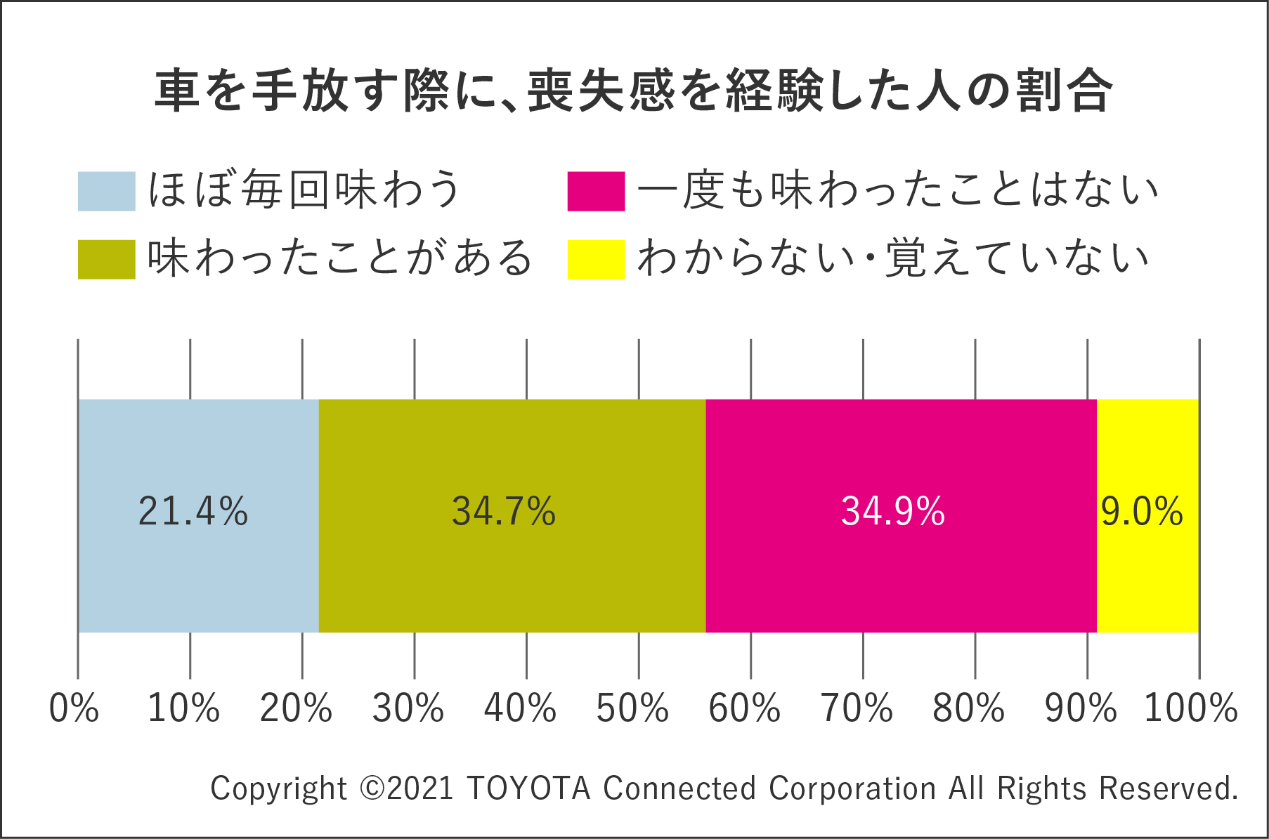実際にどれくらいの⼈が⾞を⼿放した際に喪失感を感じるのだろうか?当社で実施した調査では、実際に⾞を⼿放した経験がある⼈のうち、56%が継続する強い喪失感を感じたことがあり、うち21%は⾞を⼿放す度に喪失感を感じると回答した。