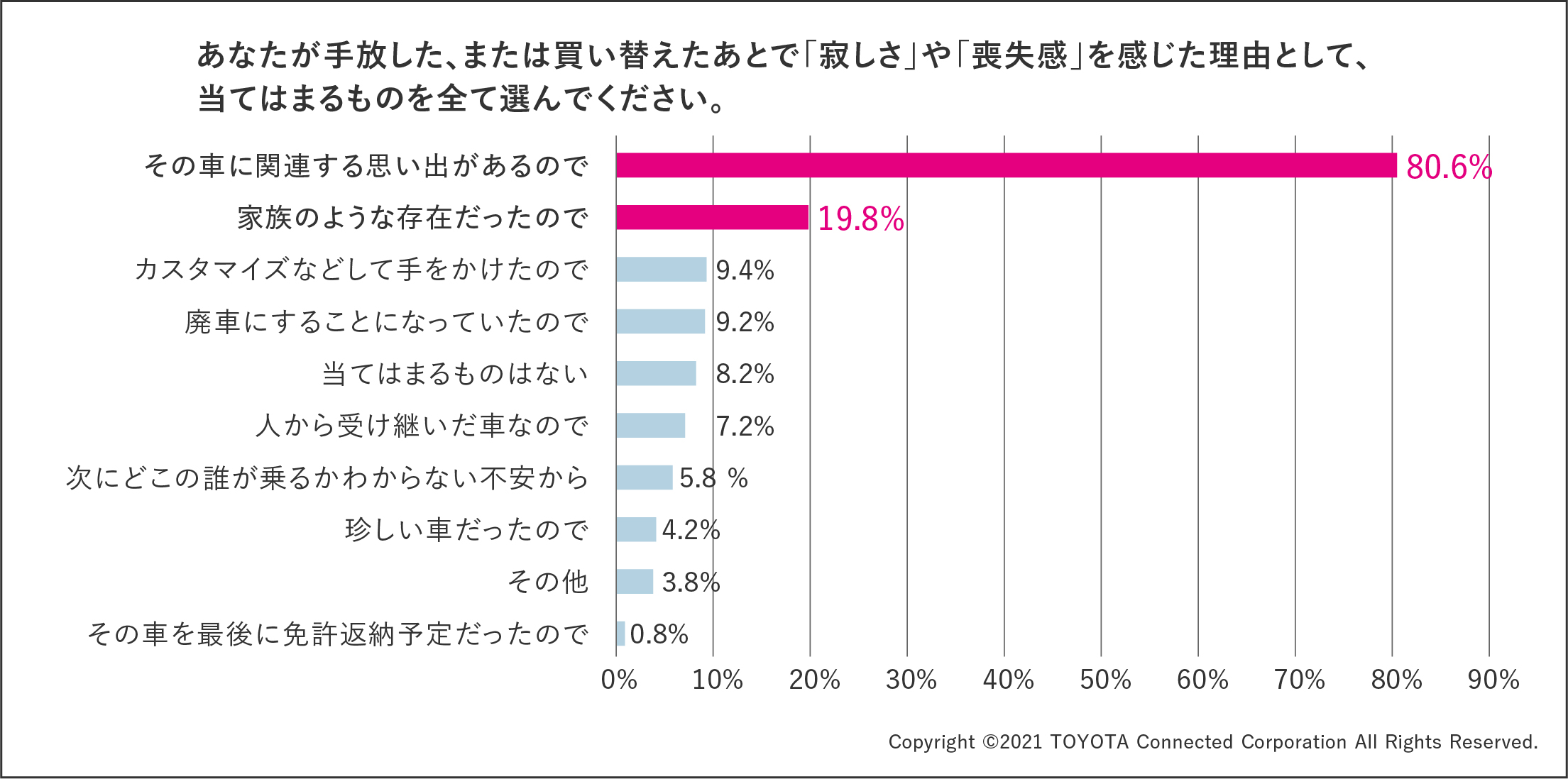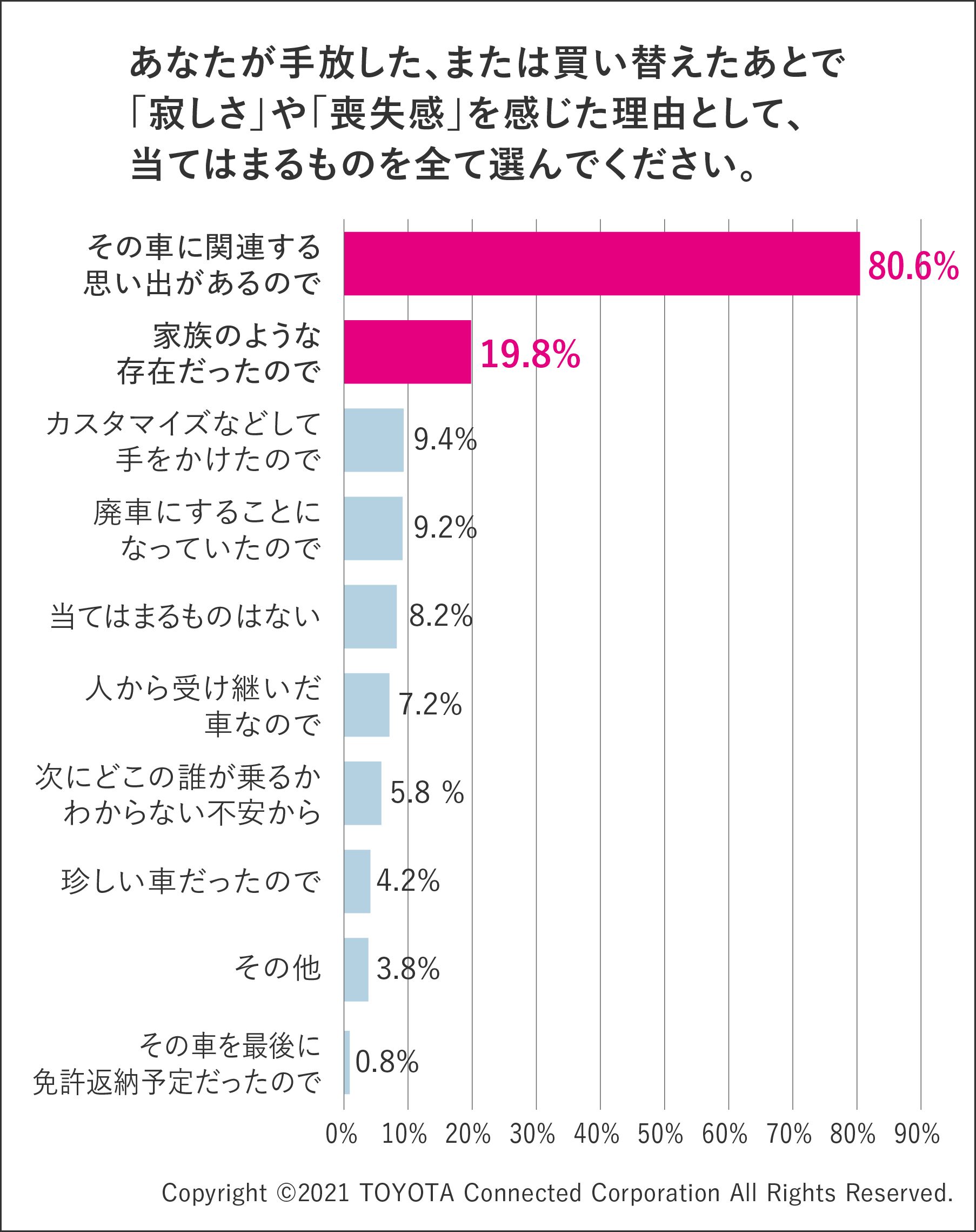 喪失感の理由としては「関連する思い出があるから(80.6%)」が最も多く、2位の「家族のような存在だったから(19.8%)」に⼤きく差をつけている。