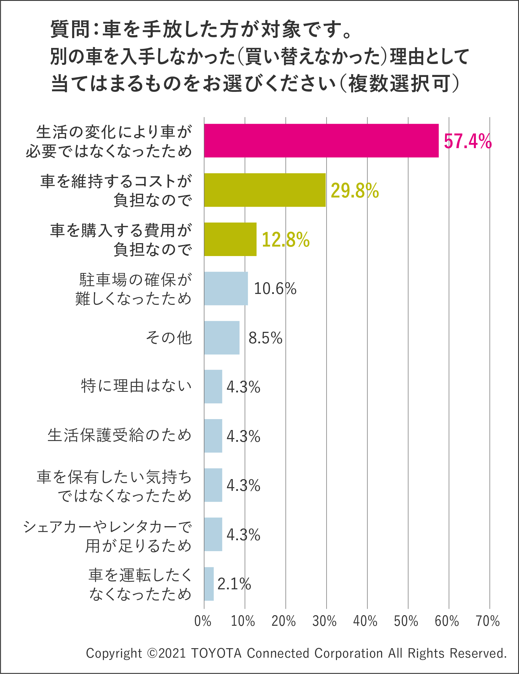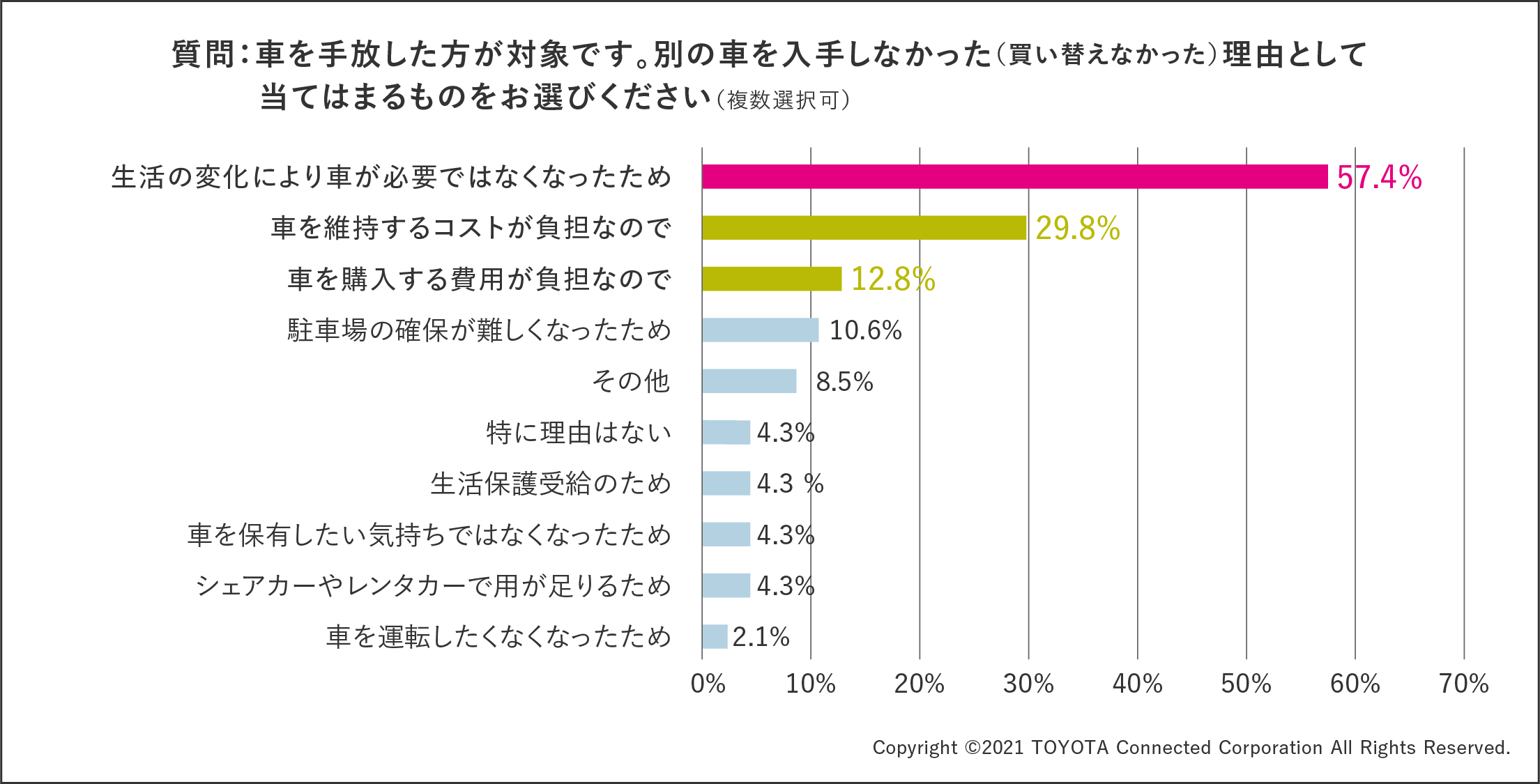 ⾞を⼿放した理由を⾒てみると、57%が「⽣活の変化」、42%が維持費の負担などといった「経済的理由」のために⼿放している。