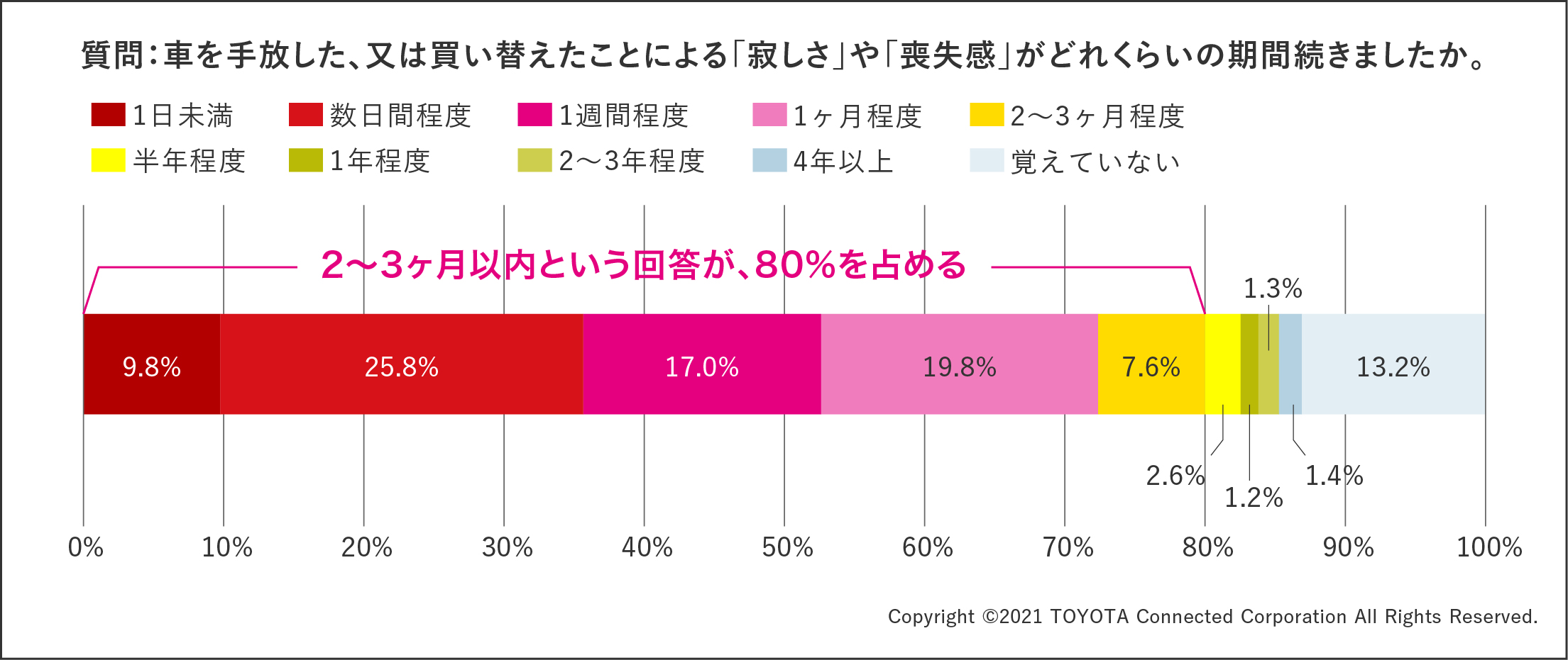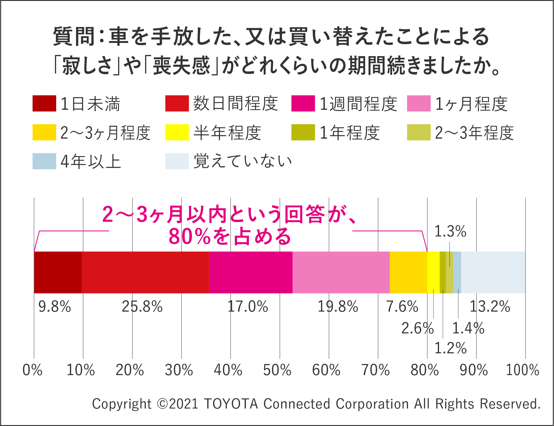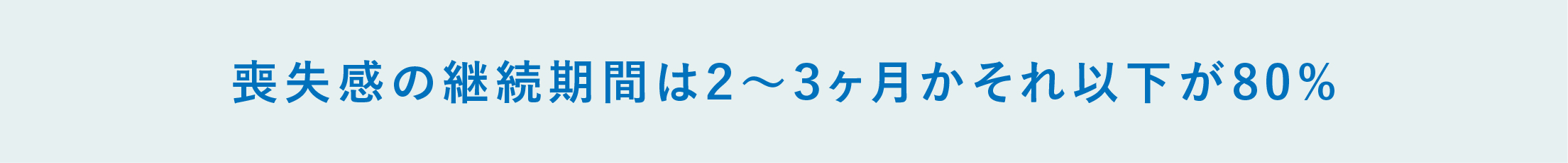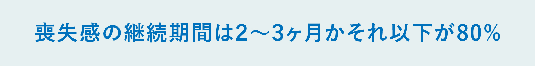 喪失感はどれくらいの期間継続したかを聞いたところ、「2〜3ヶ⽉かそれ以下」が80%を占めた。中には1年以上にわたり、寂しい気持ちを引きずる⼈もいるが、⼤半は⼀定の時期が過ぎれば、喪失感は徐々に和らいでいくようだ。