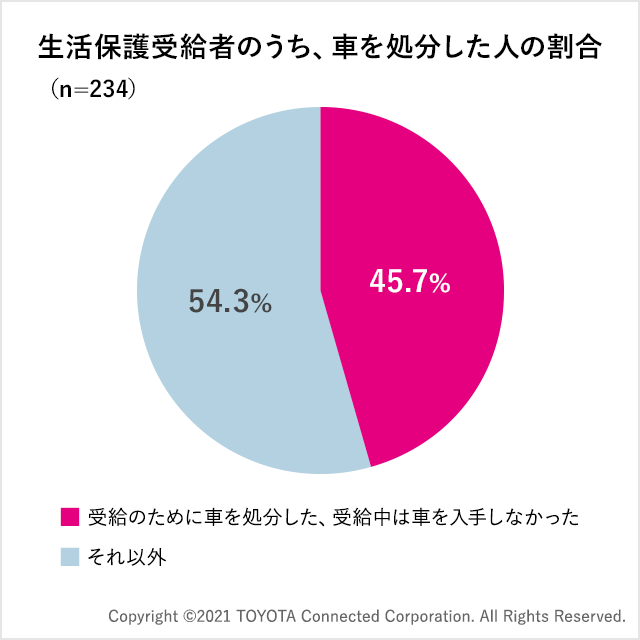我々が実施した調査によれば、⽣活保護受給者のうち45.7%が受給申請のために実際に⾞を処分している。「⾞を⼿放すと⽣活に影響が出る」と回答した⼈は全回答者の69%を占める。⽣活保護受給と引き換えに、不便な⽣活を送っている⼈が⼀定数いることが想像できる。実際に受給のため⾞を⼿放した⼈からは「⾬中の買物や移動に困る。それ以上に冬の雪道の移動が出来ない」「⽣活に必要な⼤きめの物品を配送してもらわなくてはならないので、配送料がかかる。気軽に動き回るのが難しい」といった声が聞かれた。また、日々の生活行動だけでなく「要介護者の病院への送迎が出来なくなりタクシー代が痛い」「公共交通機関の無い病院で⼈間ドックを受けていたが、⾞を⼿放して以降⼀度も受けていない」のように通院や健康管理が気楽に⾏なえなくなったといった影響も伺える。