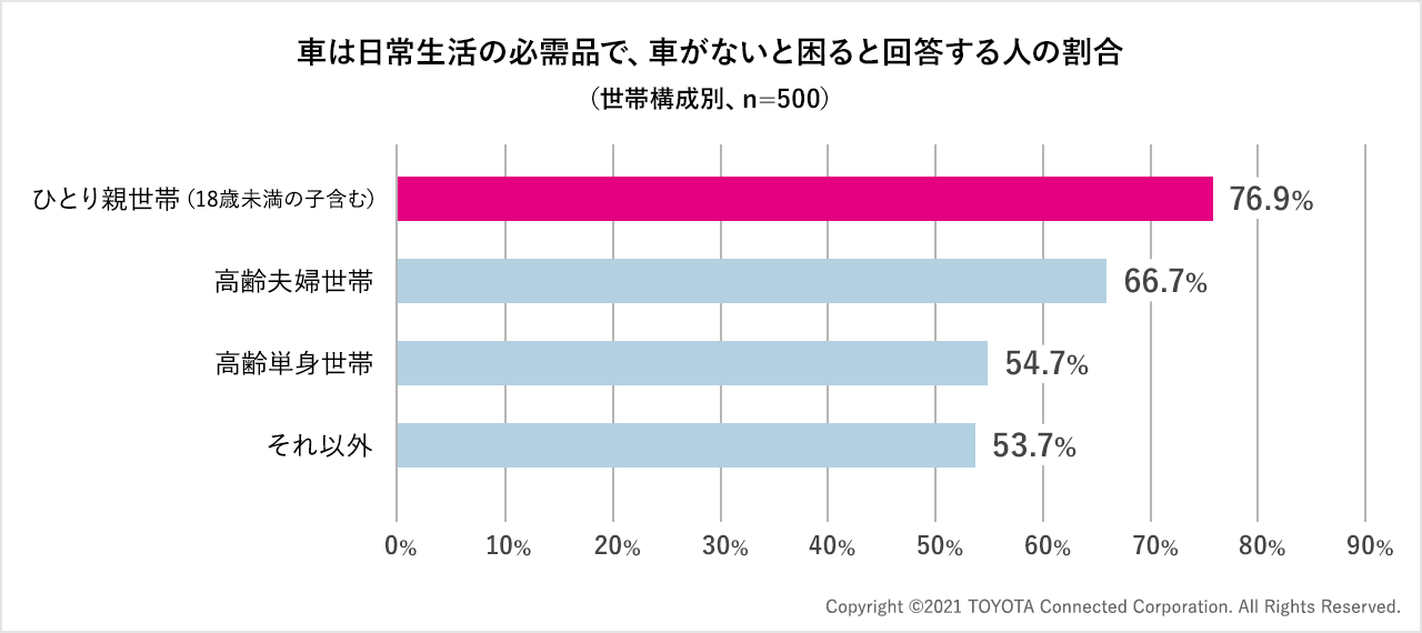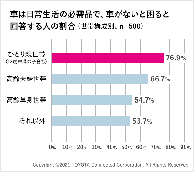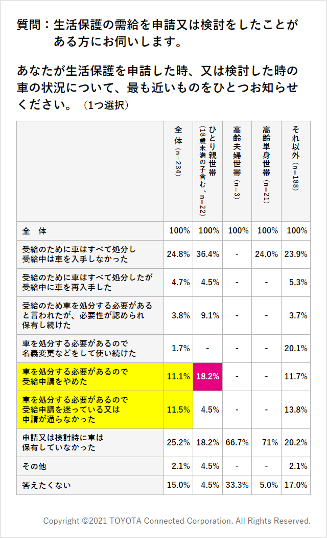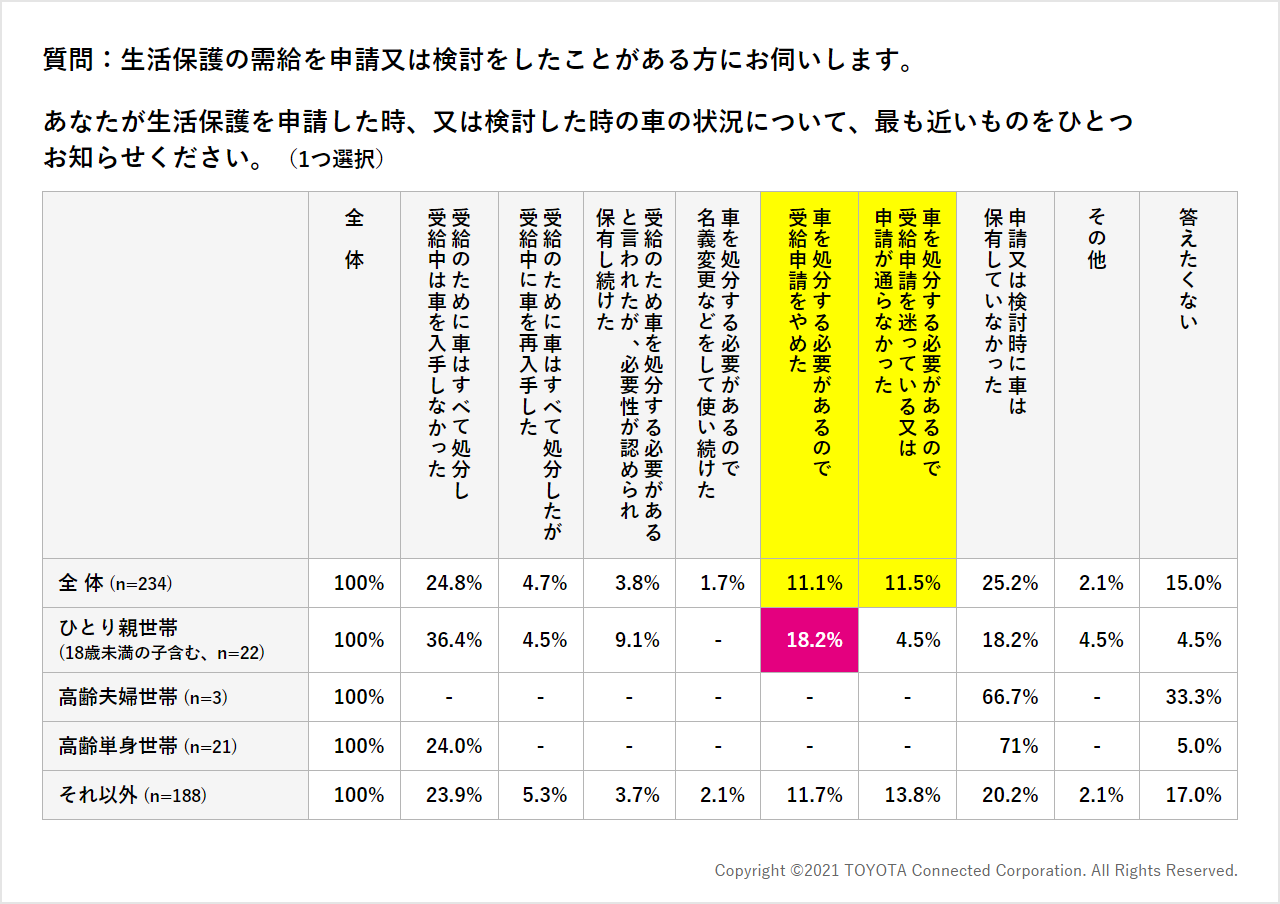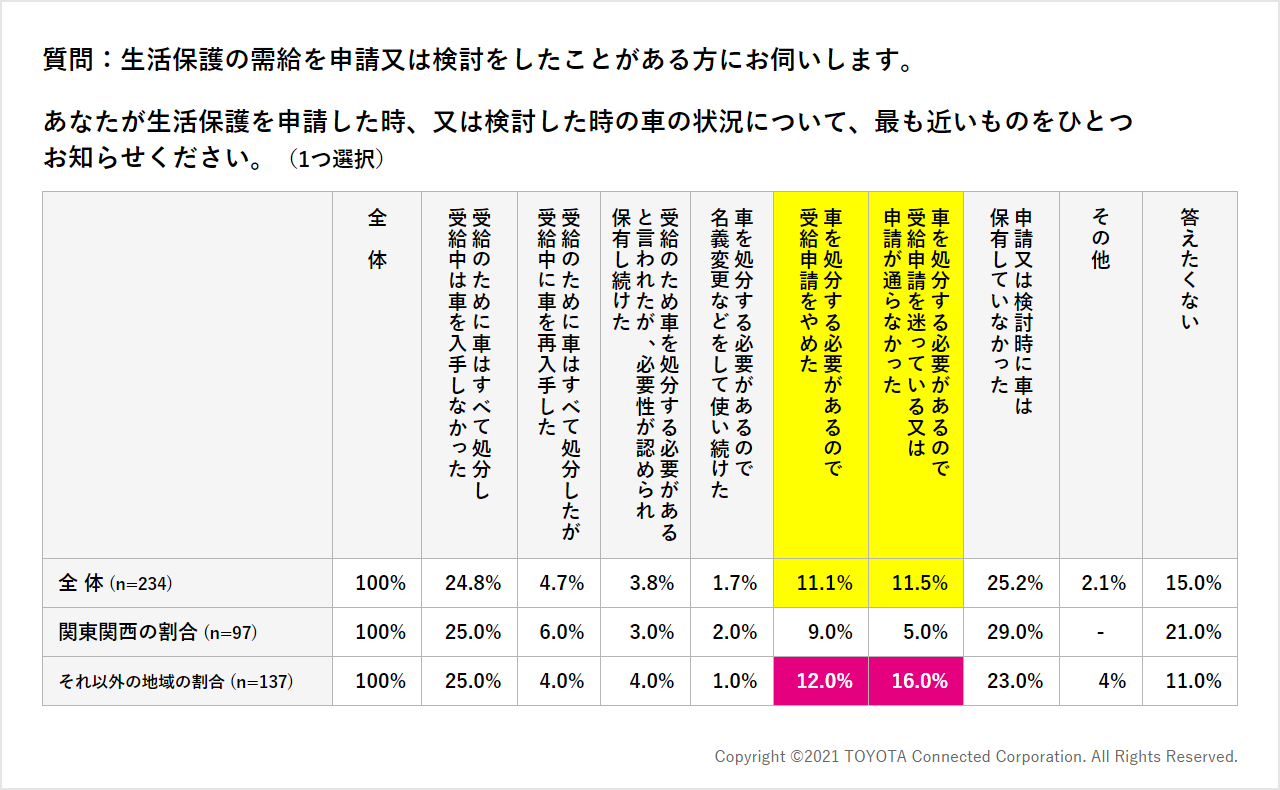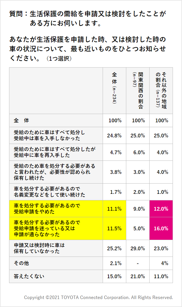 ⾞を持つ⽣活保護受給申請者は、特別な事情を認められない限り、⾞を⼿放すか、それとも申請を諦めるかの選択を迫られる。調査では「⾞が⽣活保護申請の阻害要因になっている」が22%で、特に関東、関西以外のエリアで⽣活保護申請を⾒送った層が目立つ。ひとり親世帯で「⾞は⽣活の必需品」と考える⼈は77%にのぼり、⾞を⼿放すことが阻害要因となって申請を諦めた⼈のうち、ひとり親世帯の占める割合が高い。⾞がなければ仕事や家庭の切り盛りが立ちいかなくなるため、⽣活保護の申請を諦めているという状況が想像される。