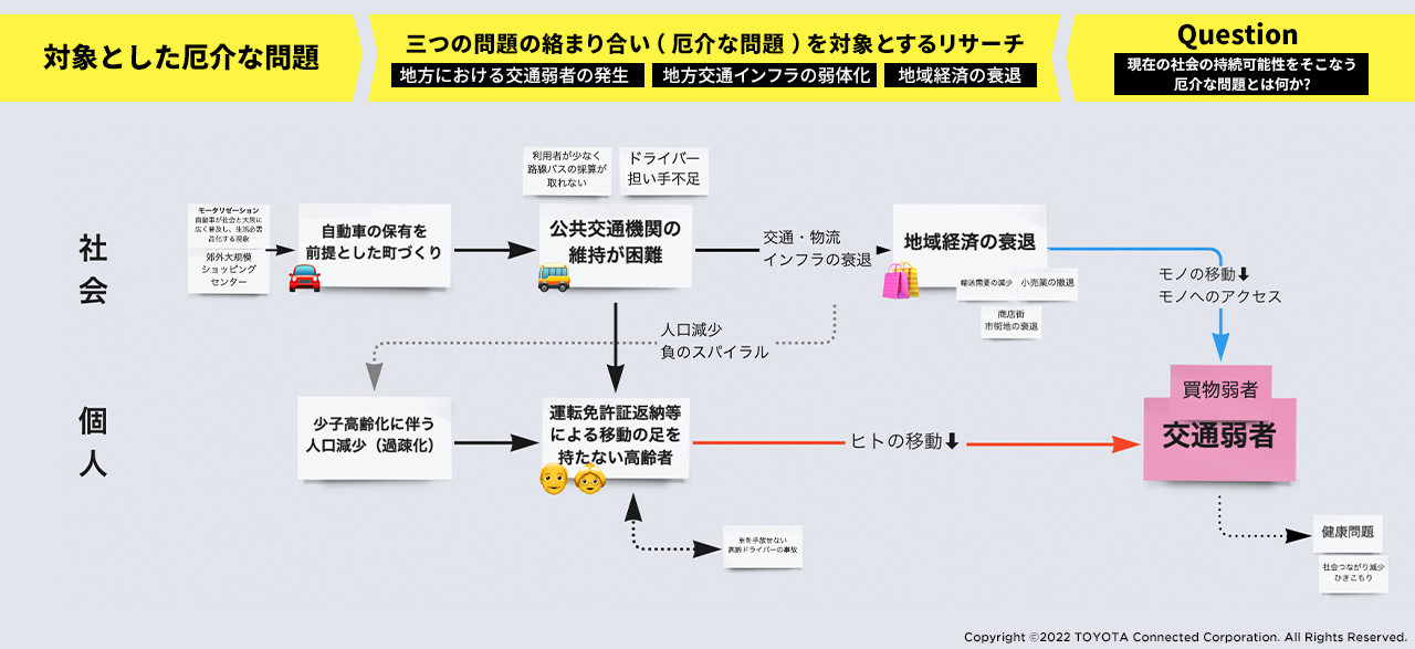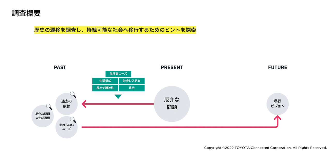 厄介な問題とは、単一のソリューションではその問題は解決ができない、また完全に解決することも不可能な問題を指します。例えば高齢化に対するモビリティサービスを考える際、高齢者ドライバーの問題や、利用が少ないため廃止が進む地方部の交通など、複数の課題が絡み合って招かれた「厄介な問題」は、常に多角的に問題を考える必要があります。そのような複雑な解を解くため、過去から現在まで変わらない価値感や、逆に時代によって変化した価値観を参考にしながら、解となる糸口を探します。