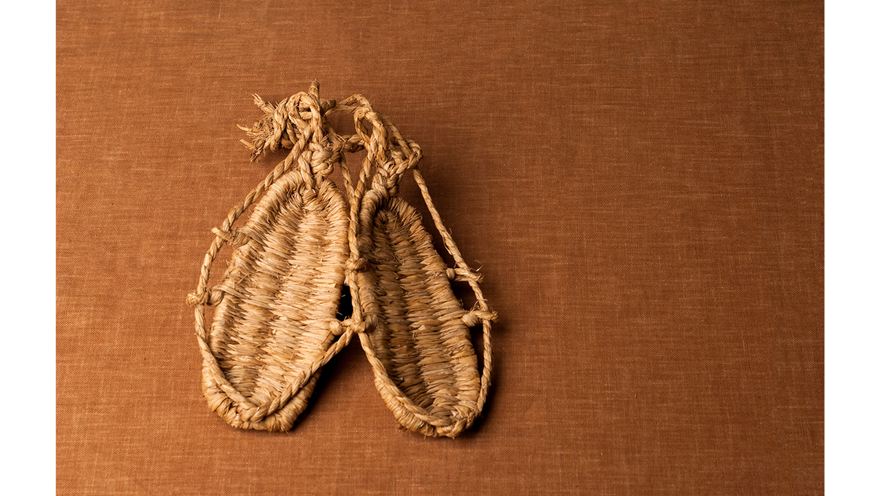 長旅となる行脚では、脚絆(きゃはん)と言われる脛(すね)を保護するための布でできた被服を足に巻き、草鞋を履いていました。草鞋は、摩擦に弱い履き物でしたが、どこでも入手可能で、且つ、自分で簡単に修理ができる便利な履き物として使われていました。