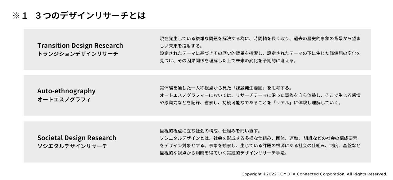 これらを駆使して調査を進めることにしました。その中から、第一弾としてトランジションデザインリサーチ(※1)を選び、サステナブルな移動において「得たもの」「失ったもの」に加えて「変わらない価値」を考察していきました。