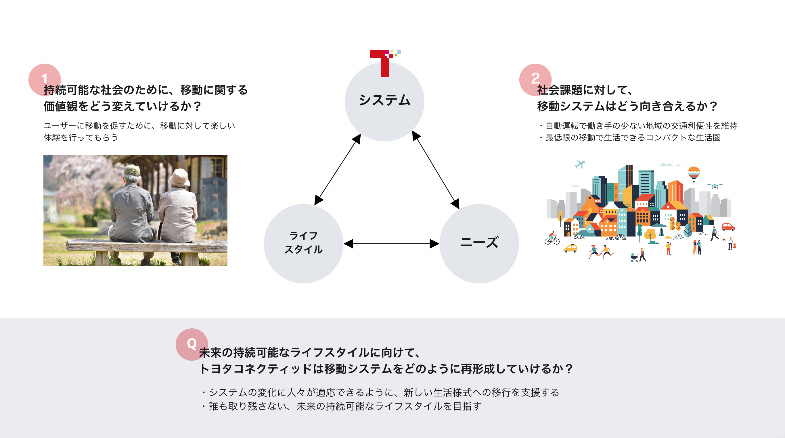 「持続可能な移動社会」つまり「サステナブルな移動」を実現するために、未来だけではなく現在と過去について深く知ること、また、多角的な視点で「移動」へアプローチすることで、より深い(ユーザーの内側に隠れている本音)を理解でき、解決すべき課題の発見も期待できると考えました。
