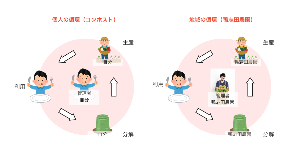 個人の循環では、コンポスト容器の容量、家庭菜園での肥料の使用量に上限があるため、生ごみを排出できる量にも制限が発生します。